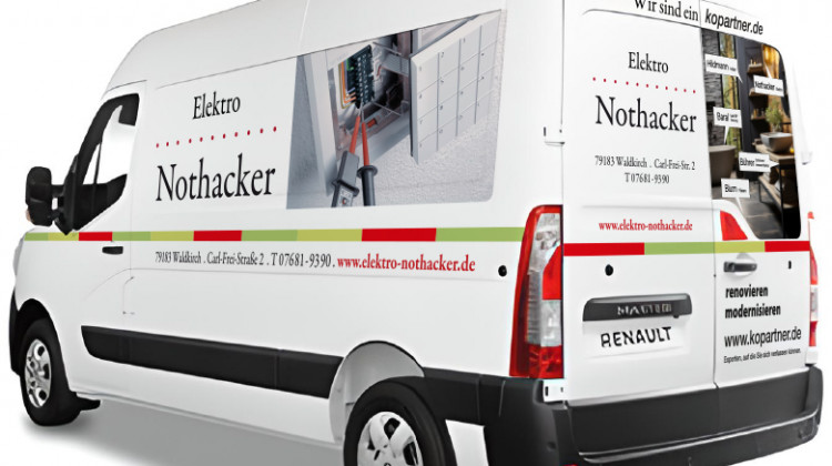 Elektro Nothacker, unser Partner für Elektro-Handwerk in Waldkirch fährt nun schon seit einigen Wochen mit seinem neuen Montagefahrzeug zu seinen Kunden. Auf dem Heck wirbt er für die gemeinsame Sache: kopartner.de  ––>
